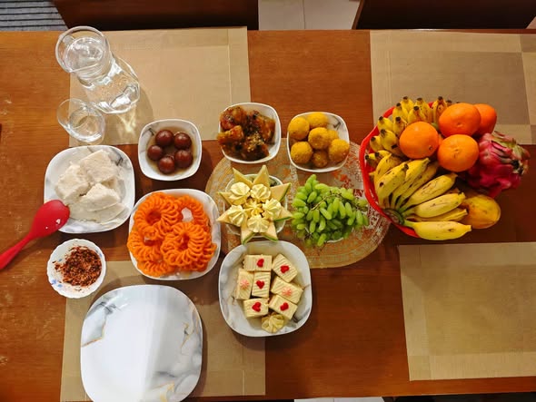 When I ask how is Onam food? Daddy's Ready... Served on a banana leaf (starting from the left to right in a set order). Usually includes 20–30 items, sometimes even more. Always vegetarian and prepared without onions and garlic in most homes. Balance of six tastes: sweet, sour, salty, bitter, pungent, and astringent. Common Items in Onam Sadhya Rice – Kerala red rice (matta rice). Parippu – Lentil curry with ghee. Sambar – Tangy dal curry with vegetables. Rasam – Spicy, peppery tamarind soup. Avial – Mixed vegetables in coconut and yogurt. Thoran – Stir-fried vegetables with grated coconut. Olan – Ash gourd and cowpeas in coconut milk. Kaalan – Yam or raw banana in yogurt and coconut. Kootu curry – Black chickpeas with yam/plantain and coconut. Erissery – Pumpkin and beans in coconut gravy. Pachadi – Sweet-sour side dish, usually made with pineapple or beetroot. Kichadi – Similar to pachadi, but with cucumber or bitter gourd. Pulissery – Yogurt-based curry. Pickles – Mango, lemon, and ginger. Pappadam – Crispy lentil wafers. Banana Chips – Fried raw banana slices. Sharkara Upperi – Jaggery-coated banana chips. Payasam / Pradhaman – Traditional desserts made of jaggery, milk, coconut milk, lentils, or rice. (Examples: Ada pradhaman, Palada payasam, Parippu pradhaman.)